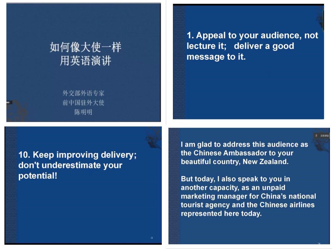 陈明明大使的讲座主题是“如何像中国大使一样用英语演讲”。他结合自身大使工作经历娓娓道来,从英语演讲与沟通的角度,传授了一系列求职、面试与工作沟通的经验,鼓励学员努力实现职业梦想。他提炼了提升英语演讲能力的10个原则,鼓励学员多练多读,提高自信心,并以他于2002年在中国旅游推介会上的演讲稿作为范例,生动形象地为我们展现了优秀的英语演讲者所应具备的特质。在问答环节,陈明明大使分享了CATTI备考经验、培养幽默感的方法、外事翻译与个人日常英语交流的差异等内容。他特别指出,在与英语受众交流时,应尽量使用故事叙述代替具有中国特色的政治话语,以提高语言的生动性和沟通效率。