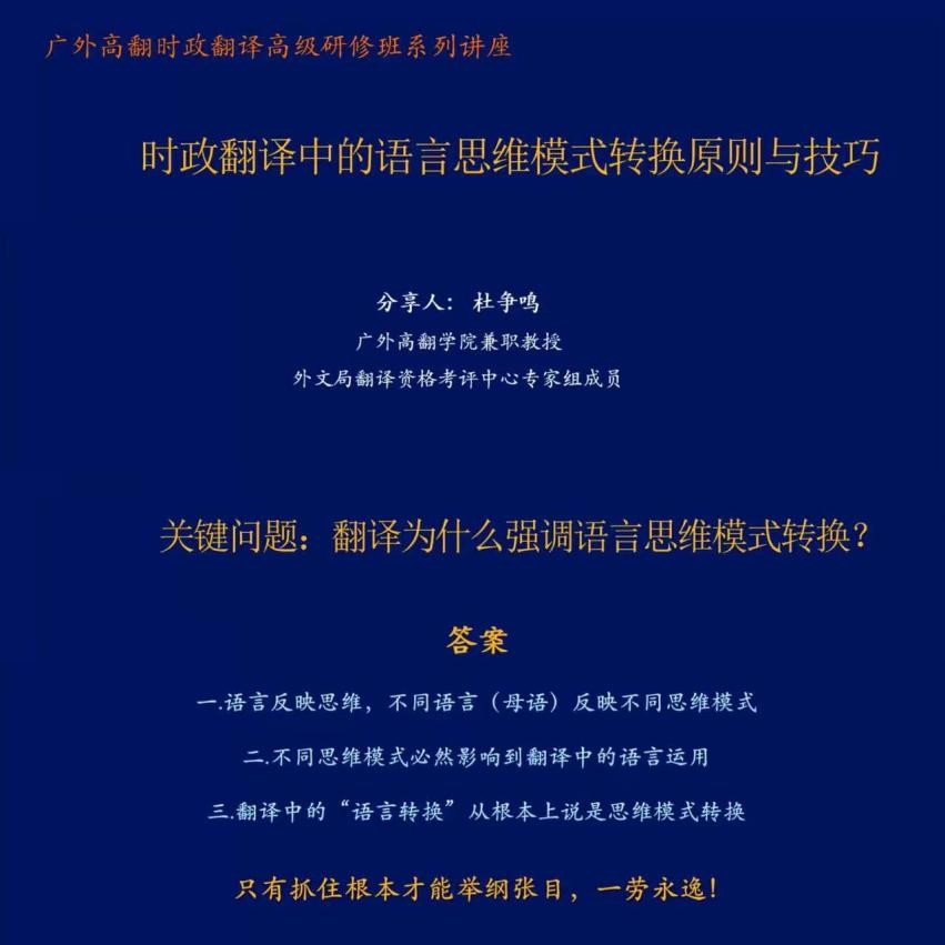 杜争鸣教授讲解了时政翻译中的语言思维模式转换原则与技巧。他特别强调,语言之间的根本差异不在于语法,而是思维模式,并打破传统的“汉语是世界上最难学的语言之一”的误区,提出了“汉语不受语法限制,是世界上最自然的语言”的观点。他高度凝练了汉英语言传统思维差异的根本规律,包括中文从语境或主题系统出发,倾向于并列对应的二元语义结构组织,强调意合,而英文从主语语法系统出发,倾向于主次分明的一元句法结构组织,强调形合等,为翻译与编译提供新思路。