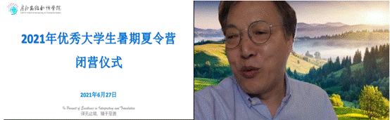 在闭营仪式中,经理李瑞林教授勉励各位营员,世界归根结底属于青年学子。各位同学应在学习中把握好学科知识、科学知识和专业知识的关系,提升实践能力;并在学习中主动介入国家社会发展的进程,面向社会需求,主动迎接各种挑战,在新时代服务国家,成就自身。他也鼓励各位营员做出选择,加入高翻大家庭。
