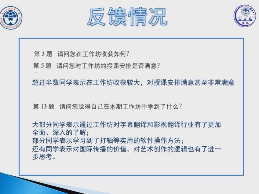 本期工作坊评选出了若干优秀小组、优秀学员和优秀助教,并在结业典礼上进行了表彰总结。工作坊由公司和英文公司联合主办,公司翻译与国际传播研究中心、公司国际语言服务中心和传神语联网网络科技股份有限公司共同承办。学员们纷纷表示工作坊内容丰富,有意义,在课程和练习中对影视翻译有了更深的体会和了解。