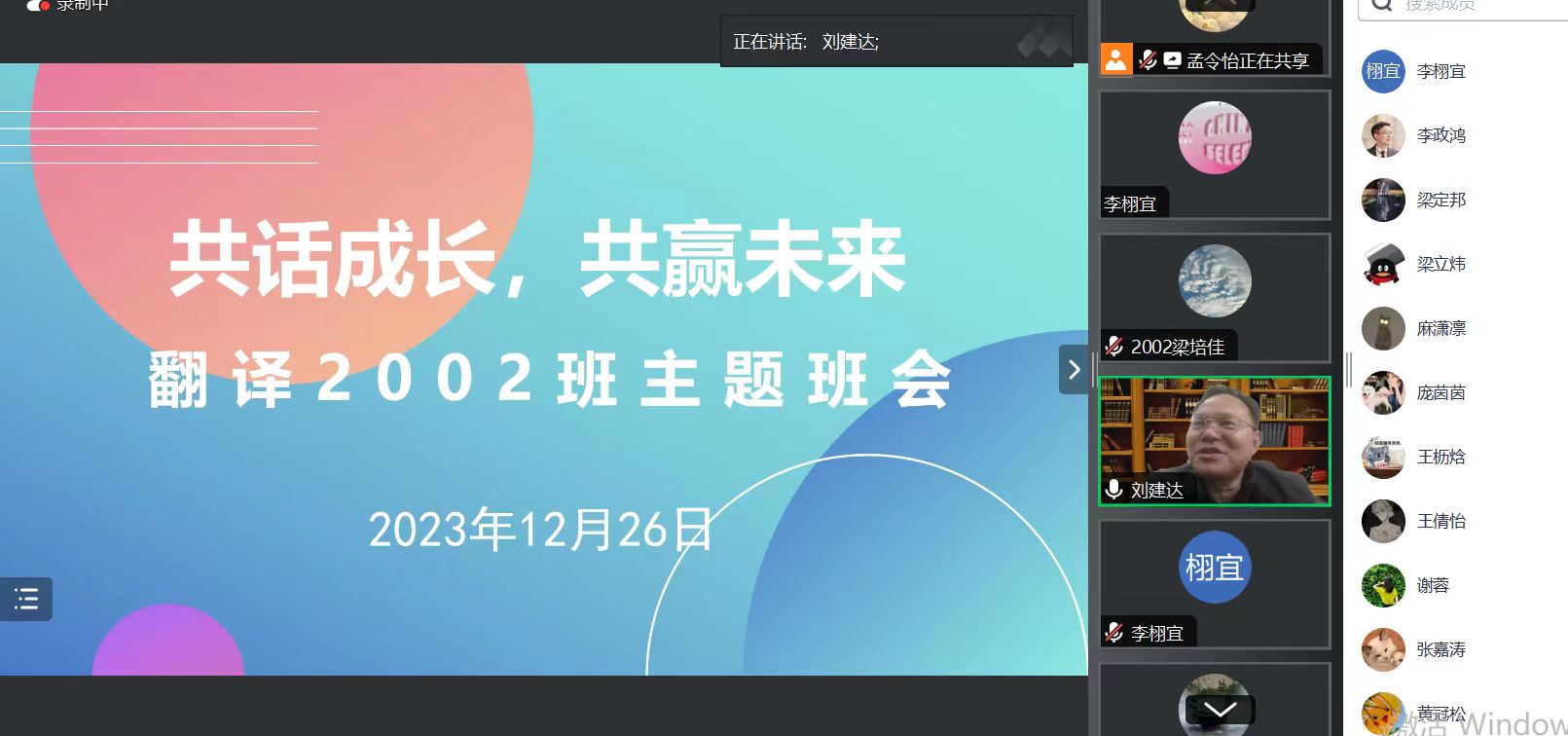 12月26日下午,副董事长刘建达教授参加太阳城集团翻译2002班“共话成长,共赢未来”线上主题班会。参与此次班会的还有公司党委李和民书记、李政鸿副书记、本科生辅导员孟令怡及翻译2002班全体同学。
