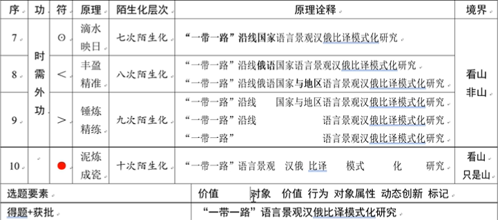 之后,黄老师以《“一带一路”语言景观汉俄比译模式化研究》为例进行了讲解,该题目的炼题经历了以下十个步骤: