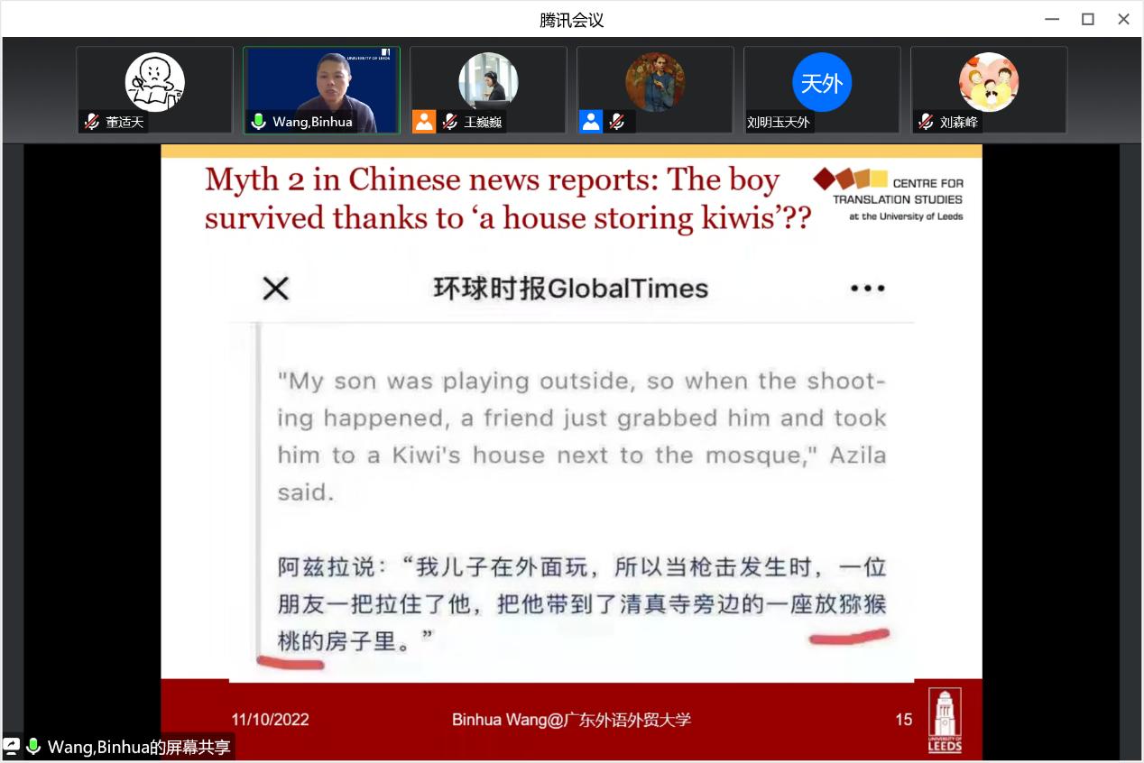 11月10日的第一场讲座中,王斌华教授从翻译的重要性在国际传播中常被低估这一观点切入,简述了历史上第一次中英官方交流中翻译的作用、现代国际新闻信息机翻的错译以及国际学术和文化交流中的翻译这三重考虑。并由此总结出翻译并非单纯的转码活动,为广大翻译学子破除了“机器翻译是否会取代译员”这一迷思。其间,王教授还以kiwi一词在新闻中的翻译,生动诠释了真正掌握好语言的重要性。
