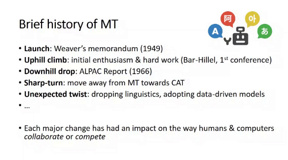 在翻译中的人机交互一讲中,Lynn Bowker教授讲述了机器翻译的历史,让我们了解了神经机器翻译时代中的人机交互系统、自适应机器翻译、交互式机器翻译和增强型翻译等新技术,还探讨了在翻译领域的人机关系,为我们深入研究人工智能时代的翻译技术奠定了基础。