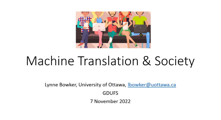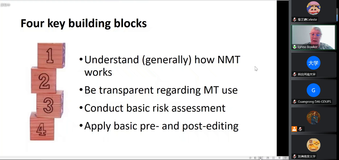 接着,Lynn Bowker教授谈到了机器翻译对社会的影响,例如非专业译员如何了解和使用机器翻译,机器翻译对翻译学习者和专业译员有什么影响,机器翻译在不同领域的使用风险,机器翻译涉及的隐私问题以及其潜在的影响。