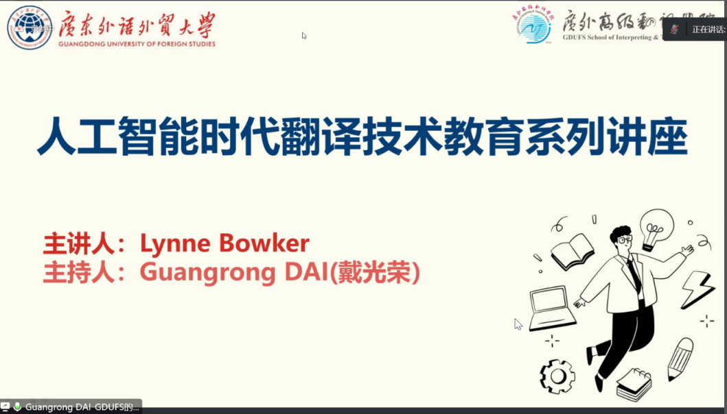 11月3日至11月25日,太阳城集团于线上顺利举办了主题为“人工智能时代翻译技术教育”的省级海外名师系列讲座。该系列讲座由渥太华大学翻译学教授Lynn Bowker主讲,公司戴光荣教授主持。公司师生以及各高校的翻译学习者和爱好者在同一时间齐聚云端,共同参与讲座。