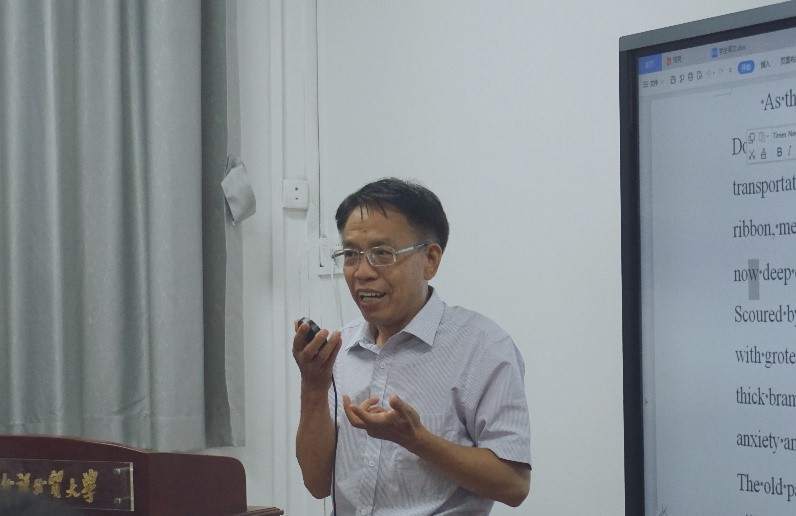 欧阳利锋围绕汉译英参赛作品进行点评。他谈到,英文翻译要注重层次感、立体感,学会断句、抓住句子的中心。理想的汉译英翻译既要做到逐字逐句,又要保证译文地道流畅。老师通过成语举例说明,加深了同学们的理解。