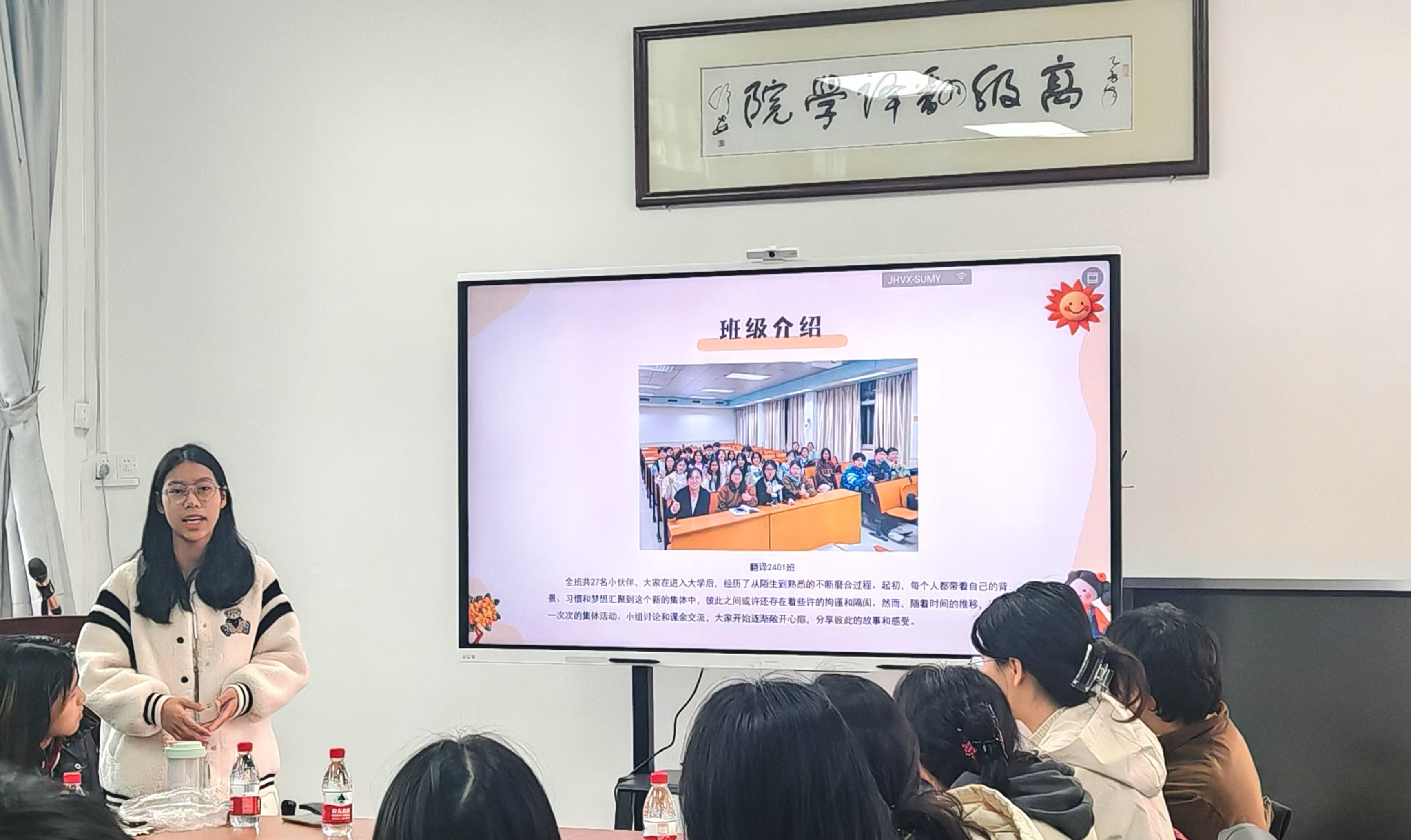 班会伊始,翻译2401班班长姚坚向与会嘉宾详细介绍了班级情况。班级由27名怀揣翻译梦想的青春学子组成,由9名同学组成的班委团队分工明确、配合默契,在班级建设中发挥着核心作用,为班级各项事务的高效推进奠定了坚实基础。入学四个月以来,同学们积极融入老员工活,通过一系列的集体活动打破陌生感,凝聚起强大的团结力量。他们在专业赛事中崭露头角,在社团活动与文艺舞台上尽情展现,表现出积极向上的精神风貌。数位班级同学也积极分享了自己进入大学以来的体会与收获。