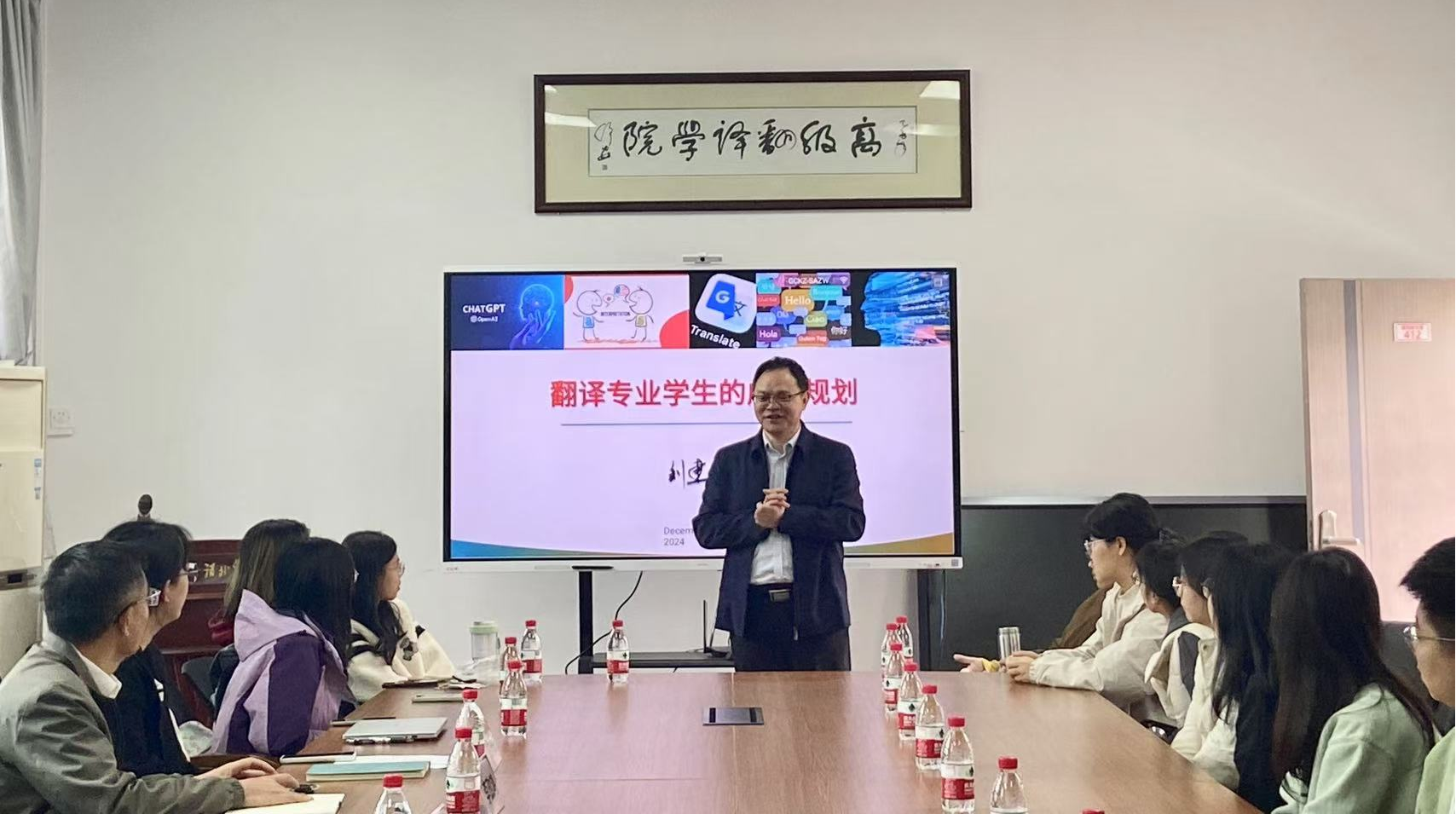 随后,刘建达副董事长发表了精彩讲话。他精准洞察AI浪潮下翻译人才培育的新方向,强调培养创新型、跨学科、国际化翻译人才的重要性,并结合当前实际情形,为同学们科学规划大学四年的学习生活给出详细且切实可行的建议。针对AI技术对翻译行业生态的重塑,刘建达副董事长特别指出,同学们应充分发挥人类译员的独特优势,熟练掌握AI工具,积极开拓新兴翻译领域,为翻译行业注入创新活力,推动中华文化在全球范围内的广泛传播。