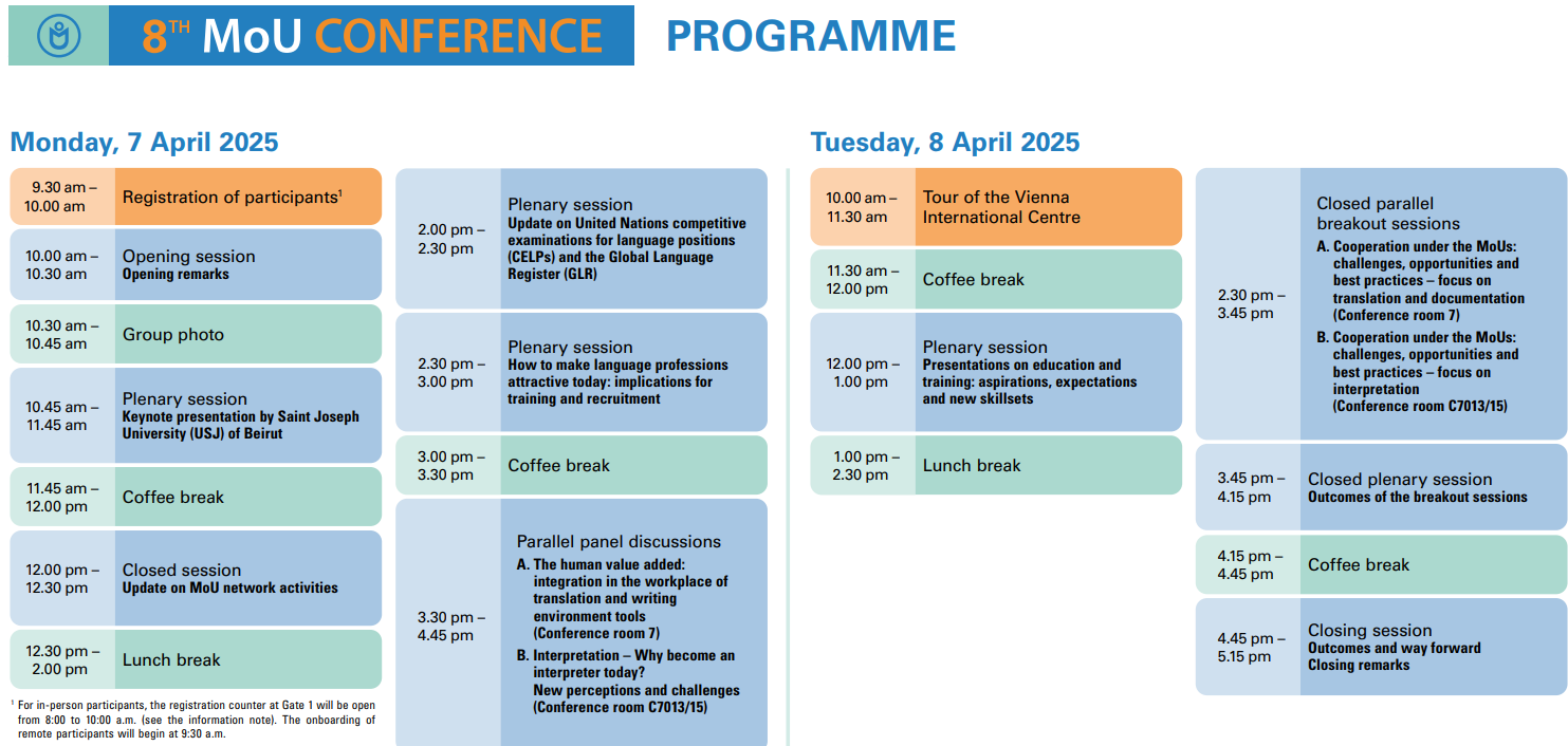 2025年4月7日至8日,联合国第八届谅解备忘录合作伙伴会议于维也纳圆满举行。此次会议由联合国大会和会议管理部(DGACM)主办,以“语言专业拥抱变革”为主题,汇聚各方力量,共同探讨语言专业在当今时代的发展路径与合作机遇。公司为中国大陆地区三所联合国谅解备忘录合作伙伴院校之一,派出王丹副经理和国际交流秘书陈芊荟通过线上方式参与了此次会议。