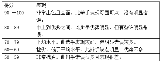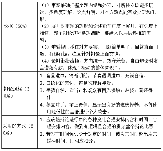 个人得分排名前八位的选手晋级决赛。个人得分同分时,按团体评分高低排名。决赛将采用英国议会制辩论方式。