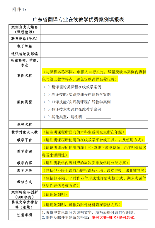 附件1:广东省翻译专业在线教学优秀案例填报表.docx