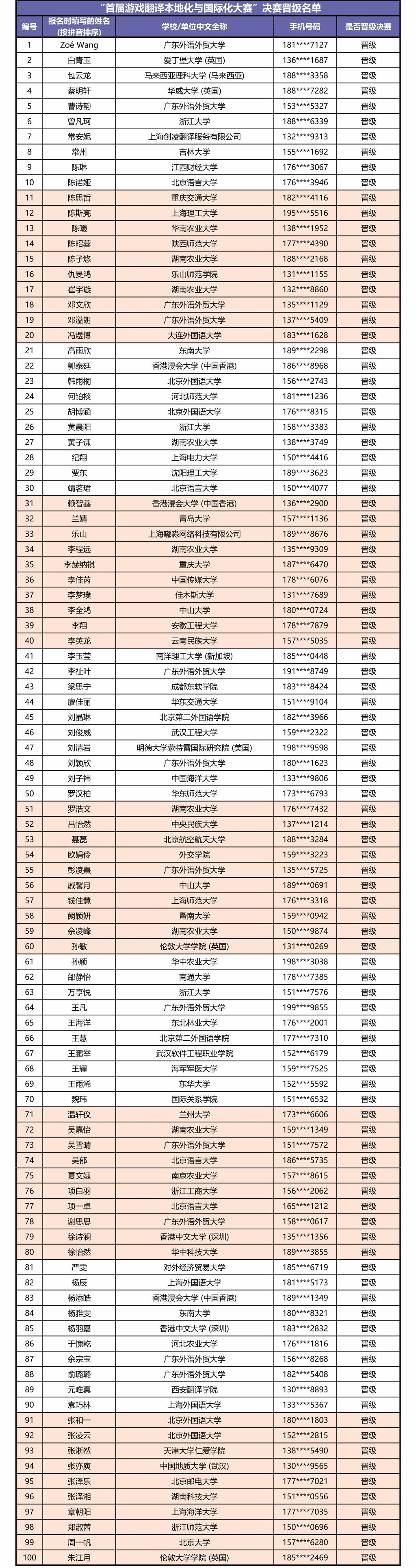 恭喜以上选手成功晋级“首届游戏翻译本地化与国际化大赛”决赛!