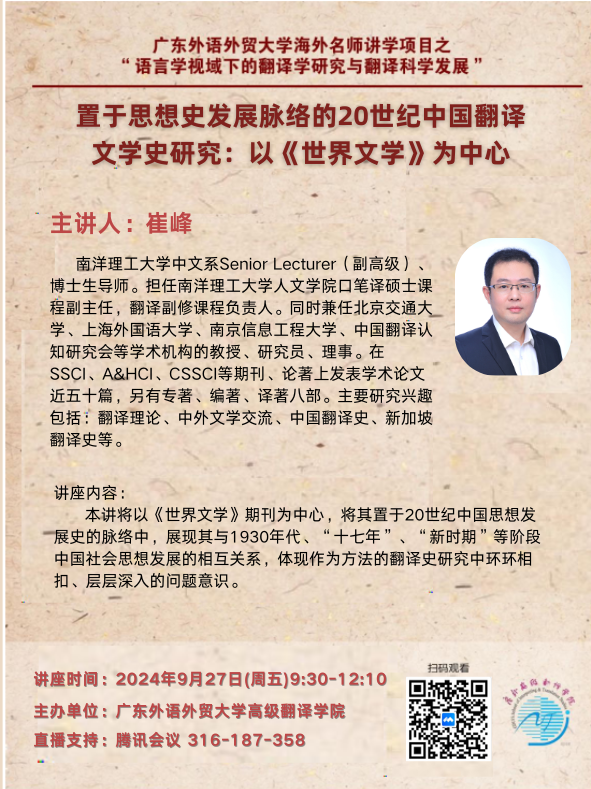 置于思想史发展脉络的20世纪中国翻译文学史研究:以《世界文学》为中心(崔峰教授/南洋理工大学)