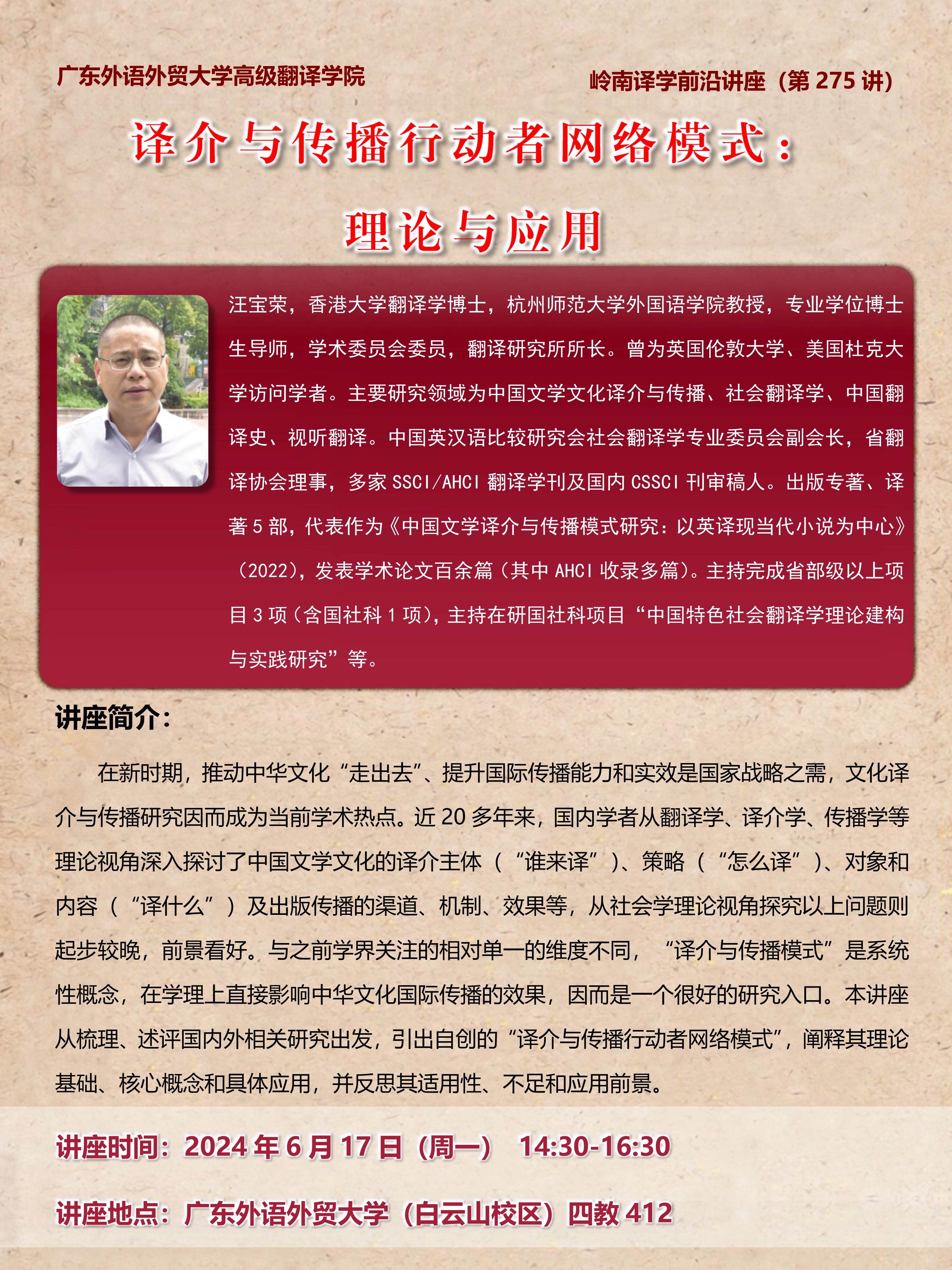 译介与传播行动者网络模式:理论与应用(汪宝荣 教授/杭州师范大学)