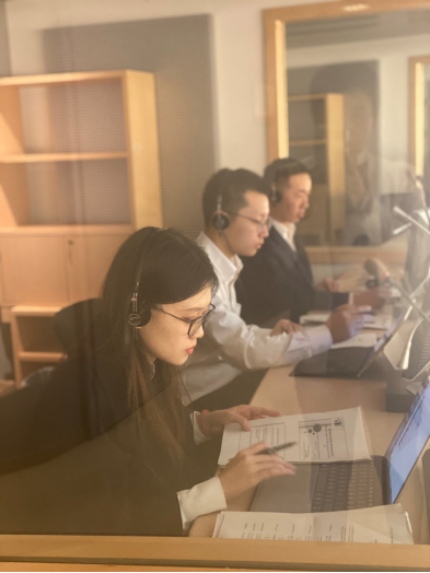 进入厢子后,大家先是观摩联合国职业译员老师的翻译,学习老师们的长难句的处理方法。对发言内容、模式有一定的了解后,同学们开始轮流尝试翻译。